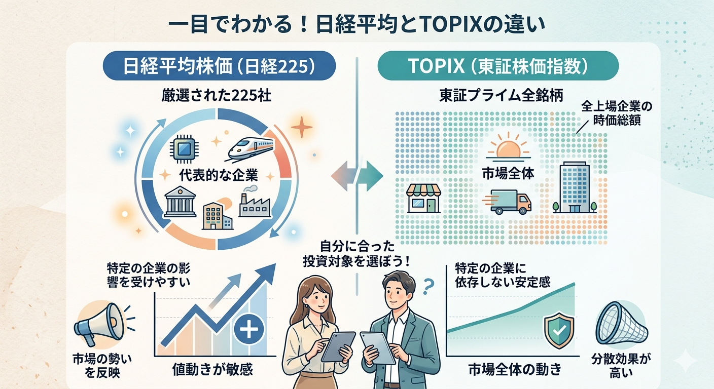 「投資を始めたいけれど、ニュースで聞く『日経平均株価』と『TOPIX』の違いがわからない」 そんな悩みを抱えていませんか?